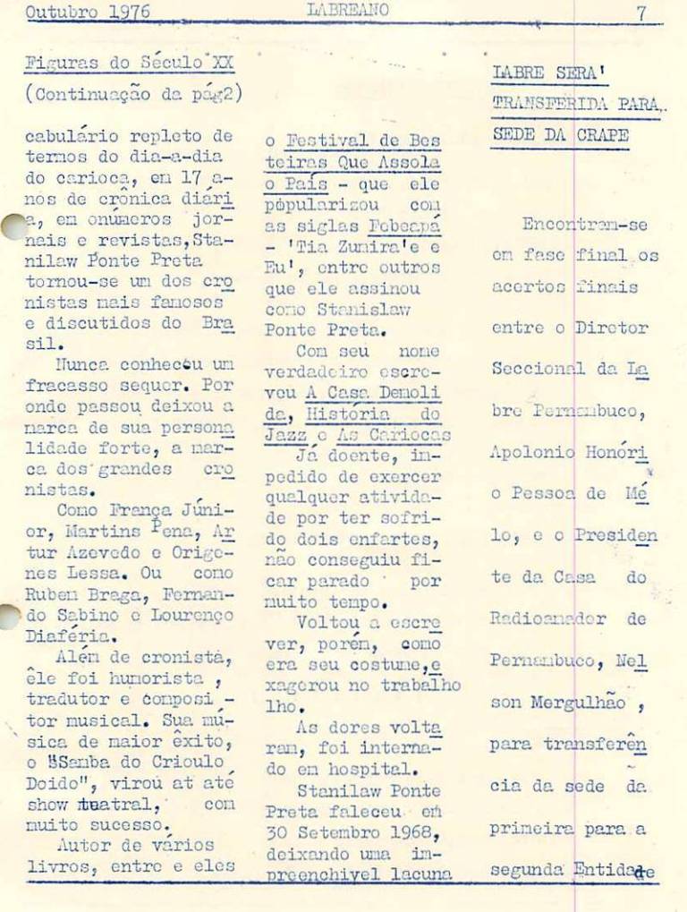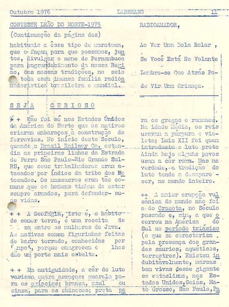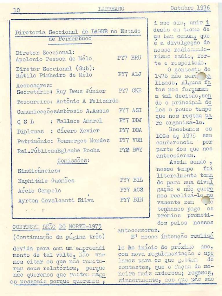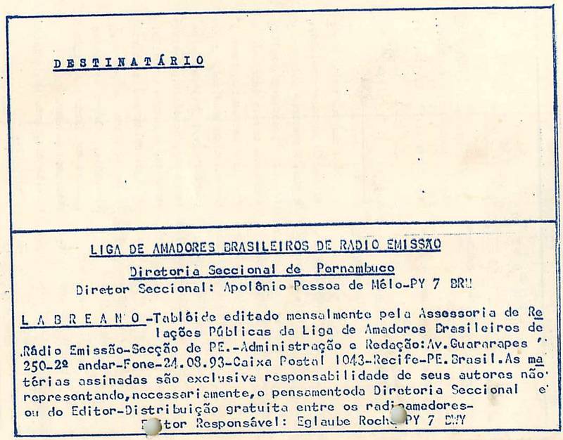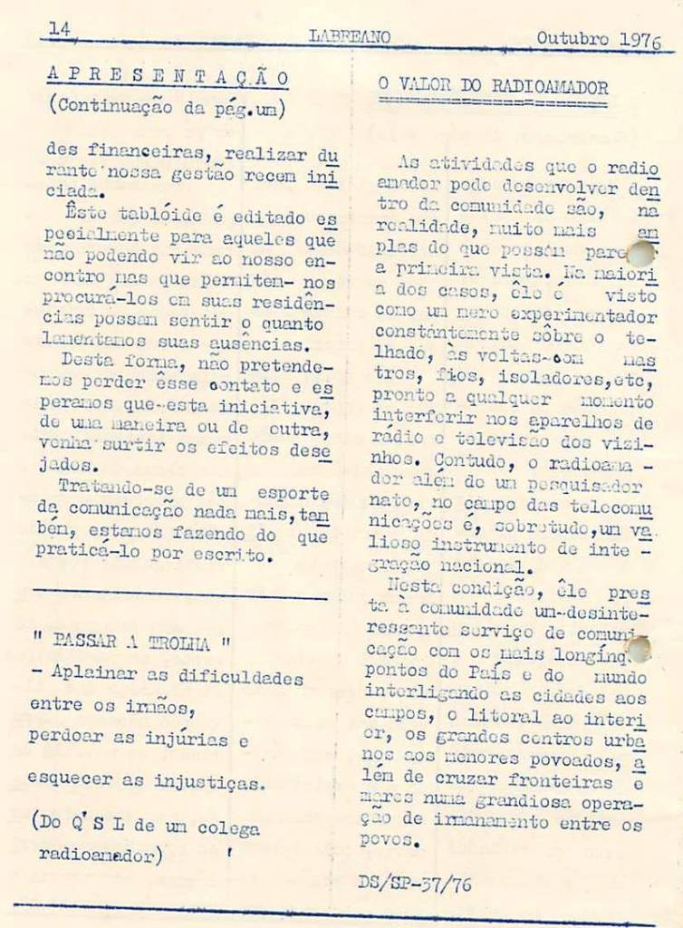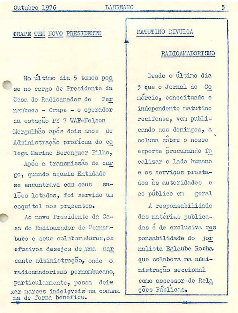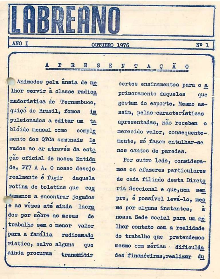 O boletim era publicado pela LABRE/PE. Ano I, nº 1, outubro/1976 .