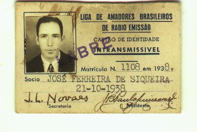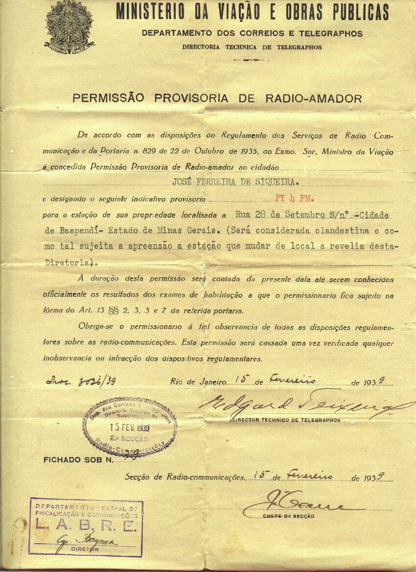 PY4FM, José F de Siqueira - Documentos originais de habilitação como Radioamador - 1938: