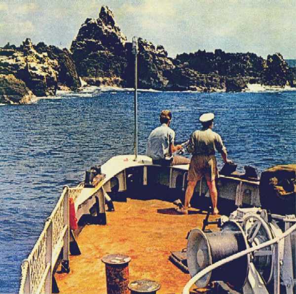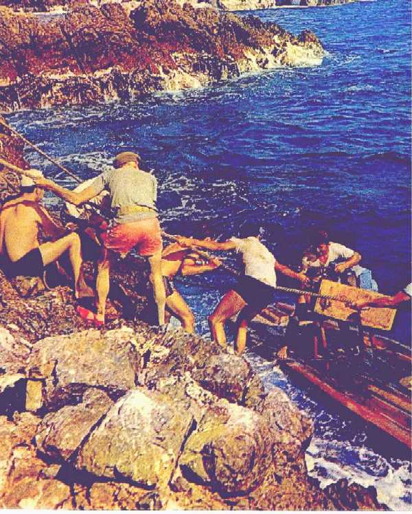 rochedo ia a mais de 140m de profundidade. Assim todo o desembarque foi uma verdadeira operação de acrobacia, com os
