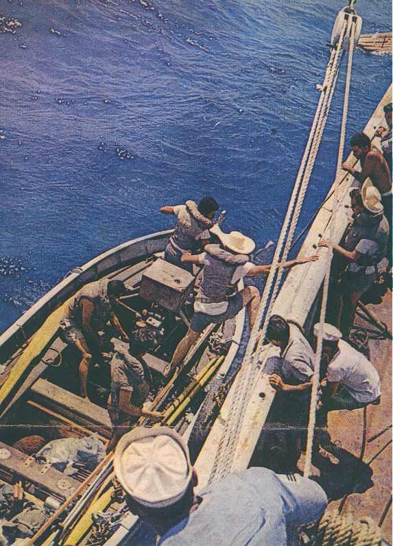 tubarão rondavam a corveta. O Cmt Barreira, temendo perder sua lancha de desembarque, ordenou que